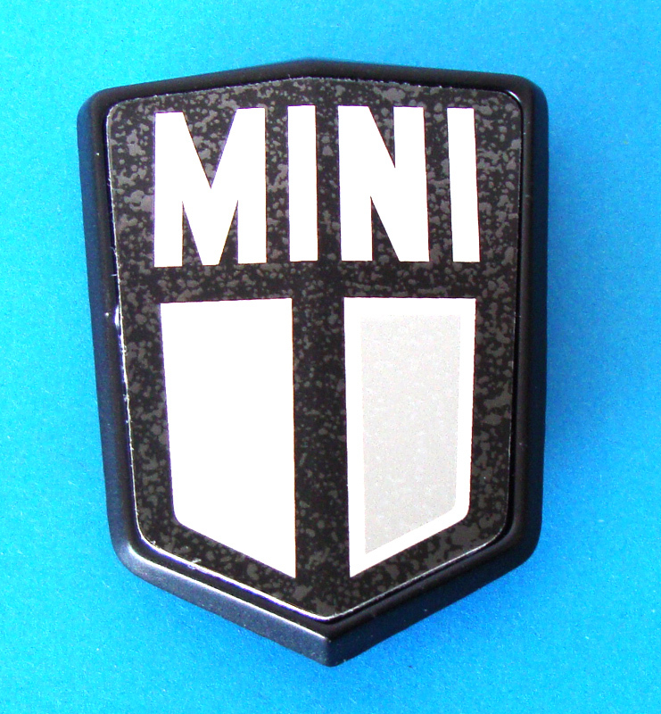 The black and silver rectangular boot badge fitted to the UK Mini Special model produced to celebrate the 20th anniversary in 1979. The plastic sleeve clips are GHF1531. This is a repro badge with a chrome, rather than black, plinth.