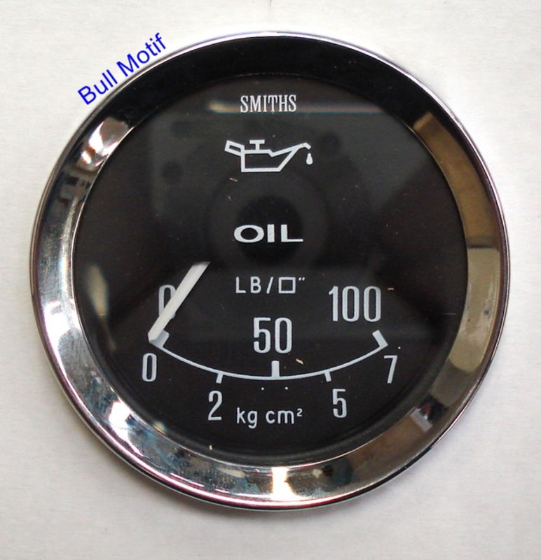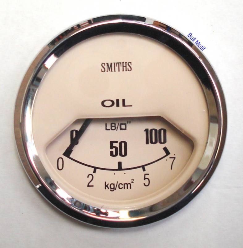 Genuine Smiths mechanical oil pressure gauge similar to that fitted to Mk1 models from 1961 to 1967 but with a magnolia face and V-shaped chrome bezel. This has markings 0-100 psi. PL2328-00C is the part number for the black face.
