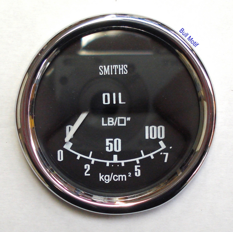 Genuine Smiths mechanical oil pressure gauge as fitted to Mk2/3 models from 1967 to 1980 but with a magnolia face and round bezel. This has markings 0-100 psi.