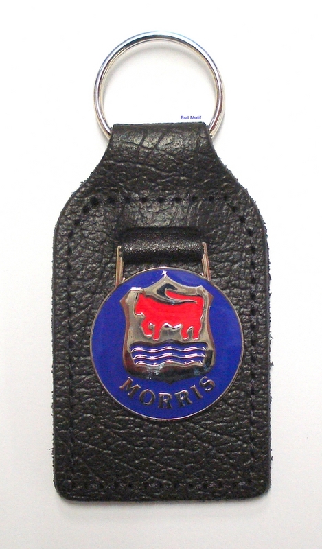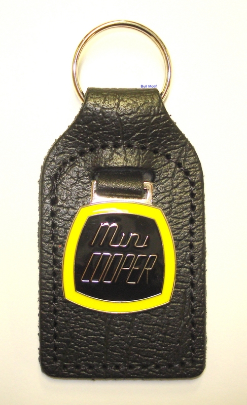 A stitched leather key fob and ring with an enamel Mini COOPER black and yellow motif.