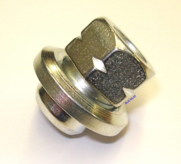 The short sleeve type wheel nut with flat washer for the 5"x10" alloy wheel made by Exacton and used on the 1979 UK Mini Special and Mayfair models from 1982 to 1984.