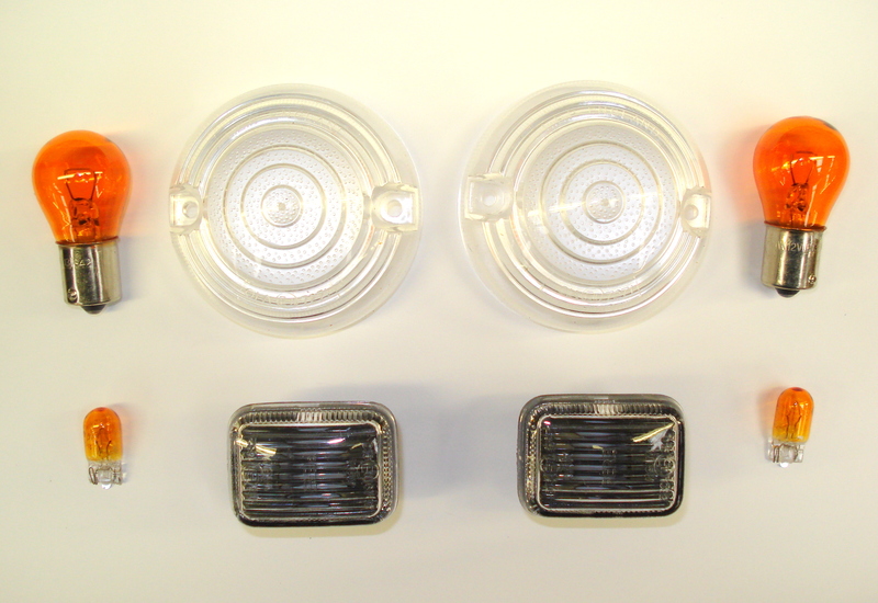A clear lens kit comprising two flasher lenses and two repeater lenses with the corresponding amber bulbs suitable for models from 1986 to 1996.
